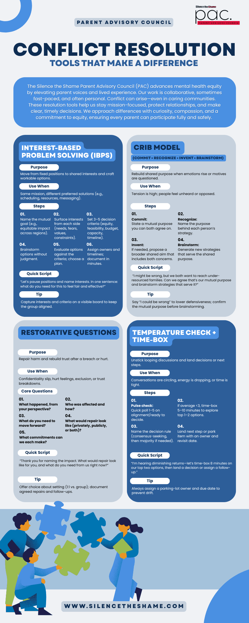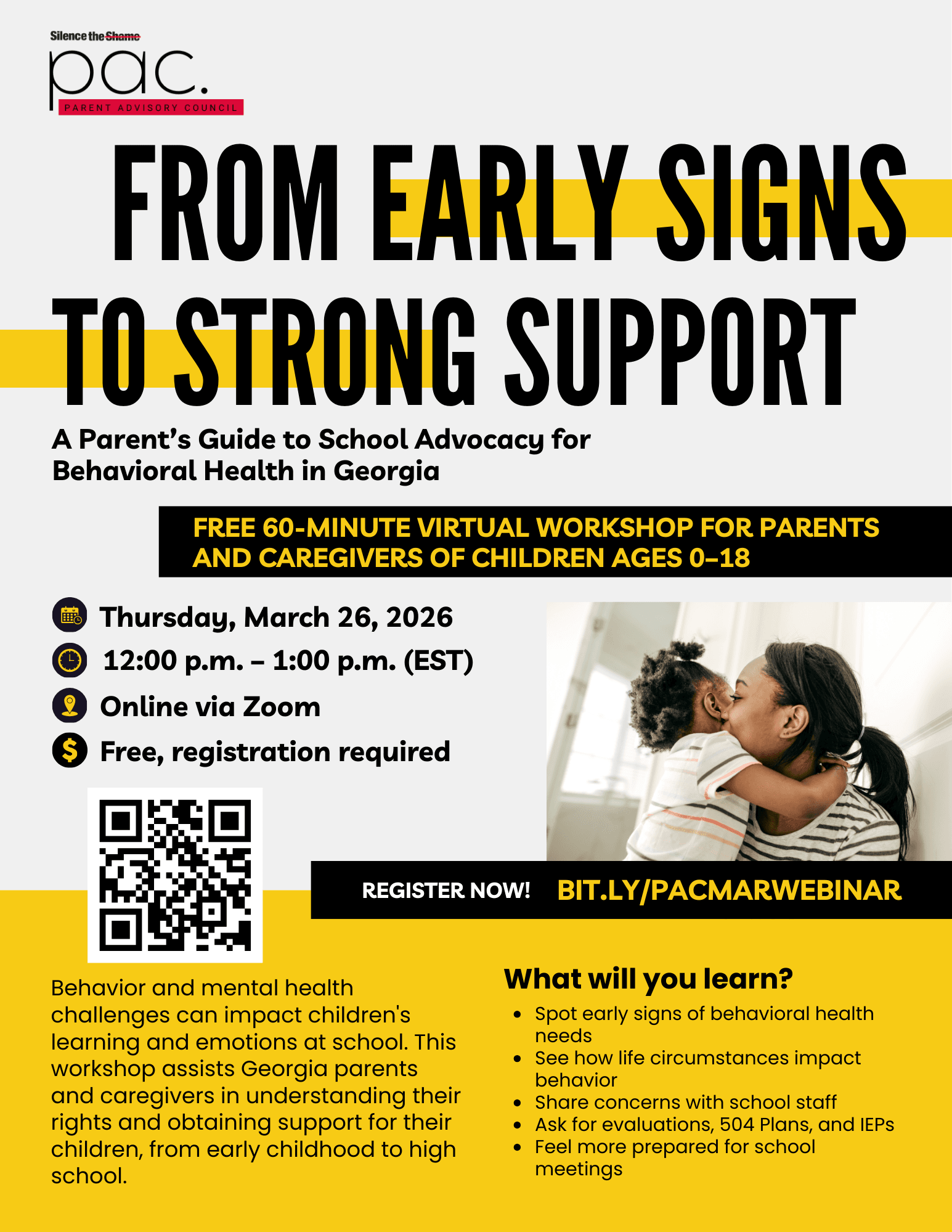 The Silence the Shame Parent Advisory Council (PAC) empowers parents and guardians as advocates for youth behavioral health awareness and support in Georgia. The PAC provides a parent-driven platform to support and advocate for youth behavioral health initiatives in partnership with Silence the Shame.